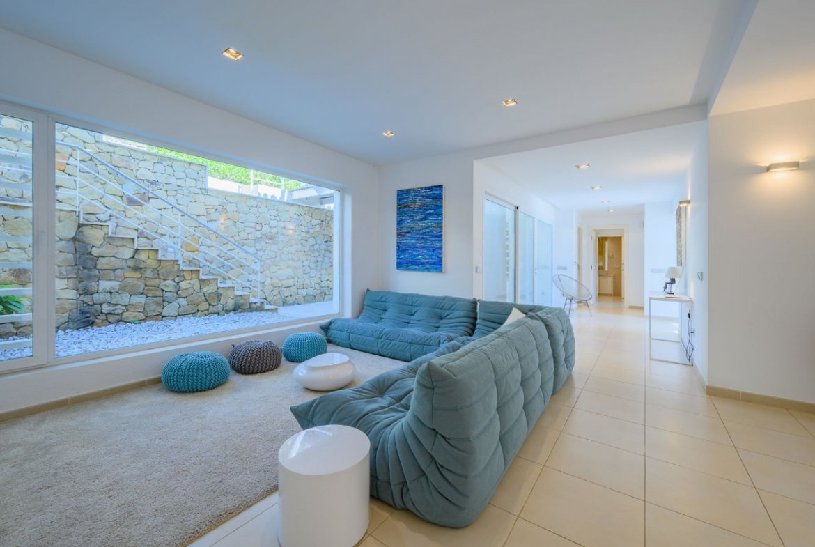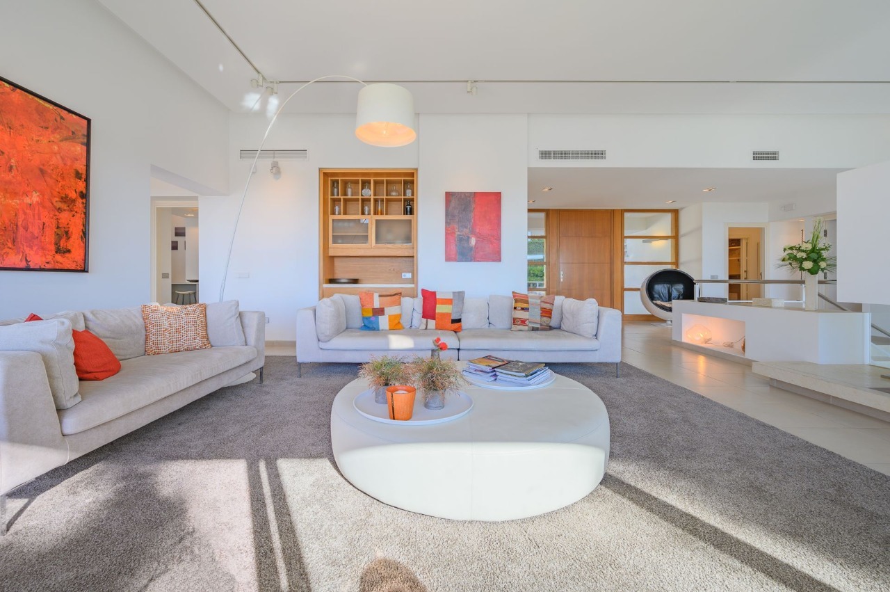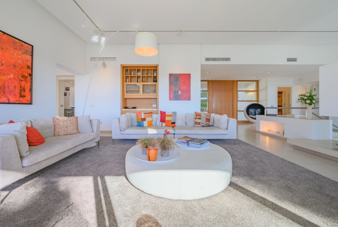 The villa’s interiors showcase contemporary architecture with bright, spacious rooms, high ceilings, and luxurious finishes. The expansive living room with fireplace seamlessly connects to a large covered terrace, providing stunning Mediterranean sea views. Adjacent to this space is an elegant formal dining room and a fully fitted modern kitchen featuring a central island and a separate barbecue terrace.