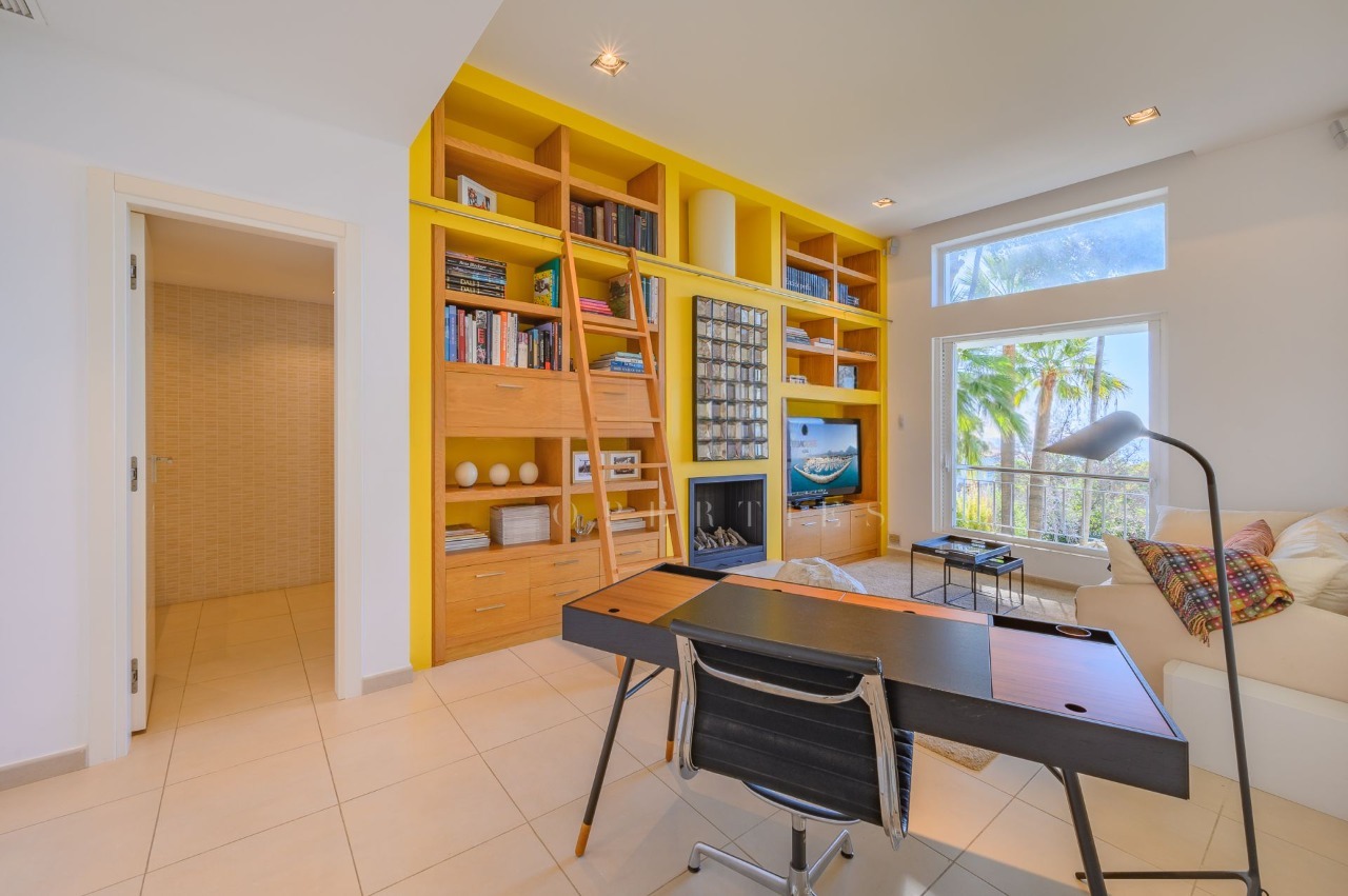 Accommodations include a luxurious master suite with spectacular sea views, complemented by five additional spacious bedrooms, each with its own en suite bathroom. Further enhancing comfort, the villa offers a cosy TV room with fireplace, a private library, and a separate office space ideal for remote working.