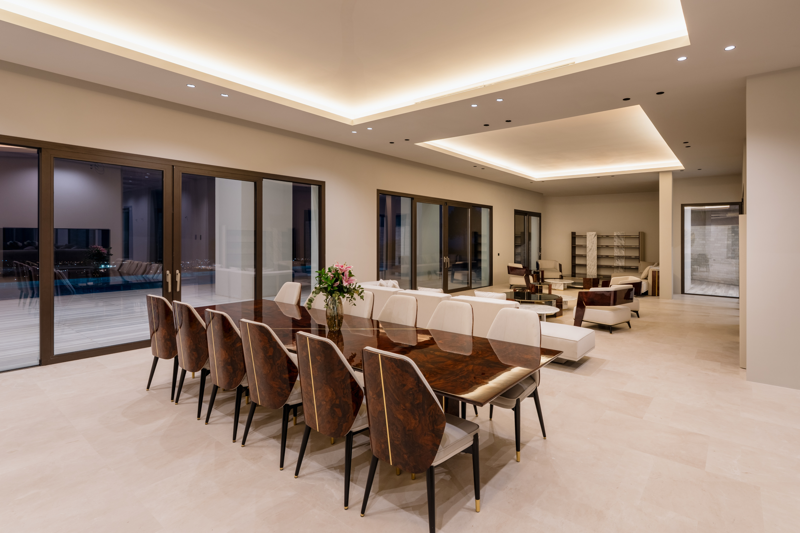 In addition, the formal dining room features furniture by Bentley Home and lighting by Manooi.