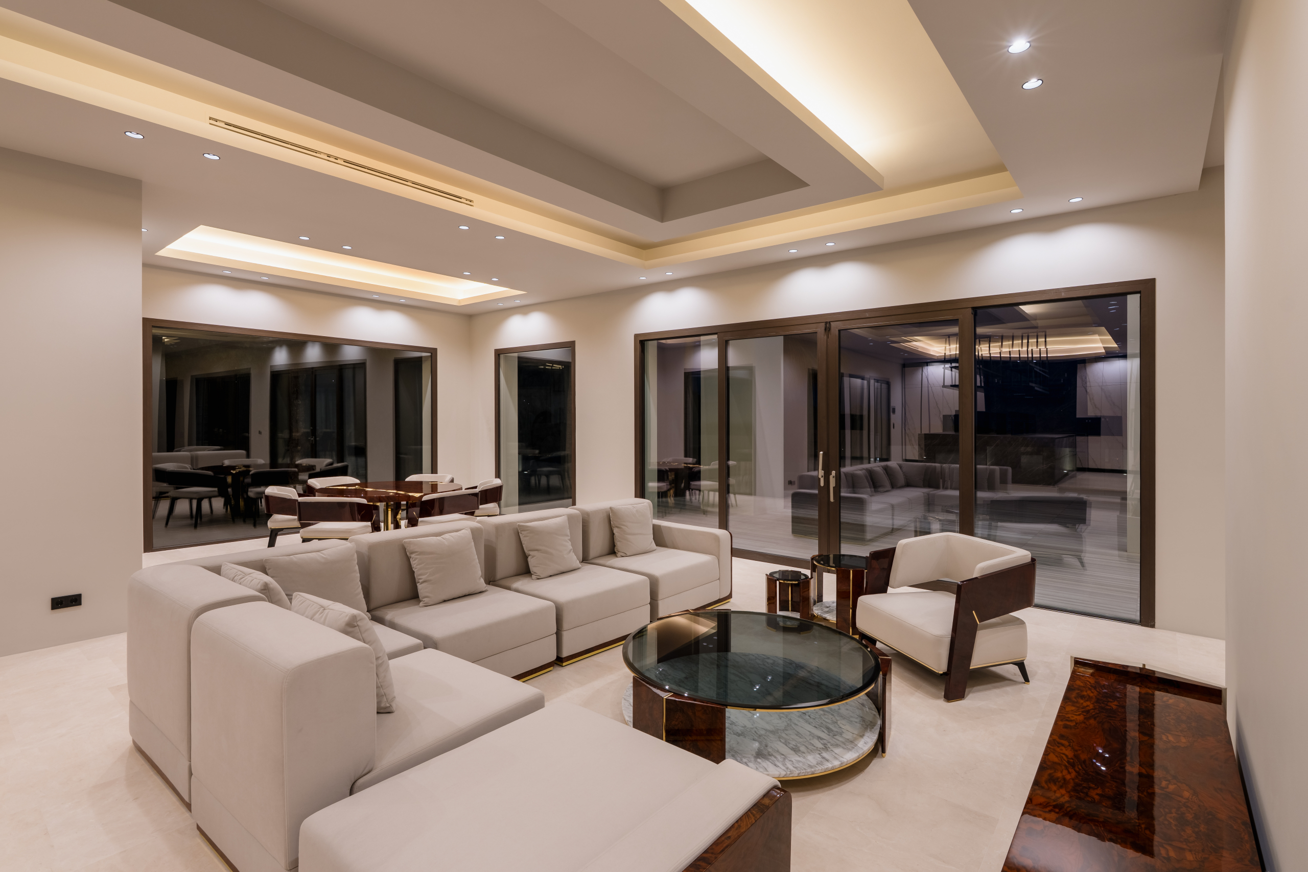 The formal reception areas include a large main living room furnished by Fendi Casa, complemented by advanced Bang & Olufsen audio-visual systems.
