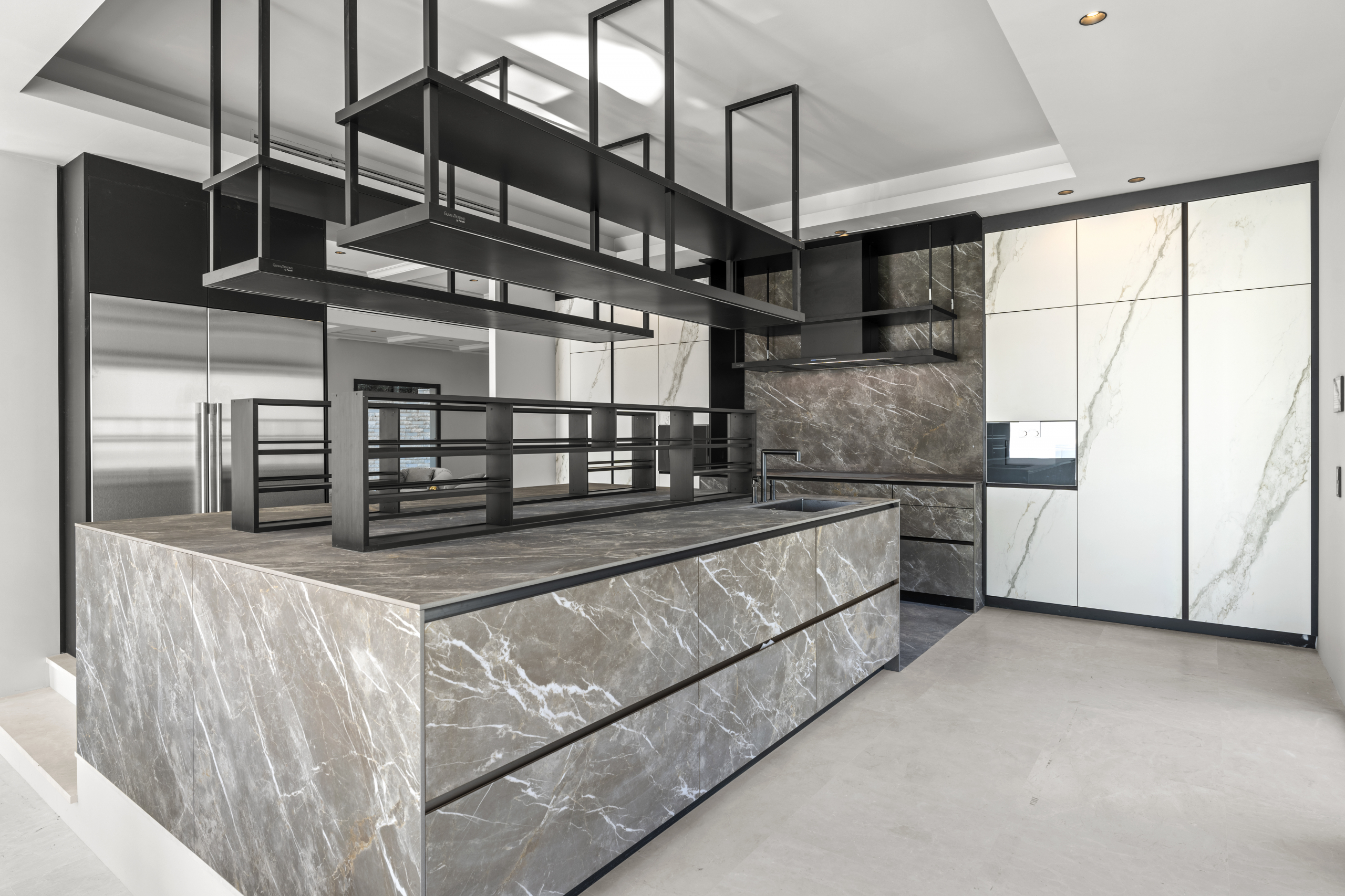The impressive 100 m² designer kitchen, fully fitted by Eggersmann and Gaggenau, features professional-grade appliances and exceptional workspace.